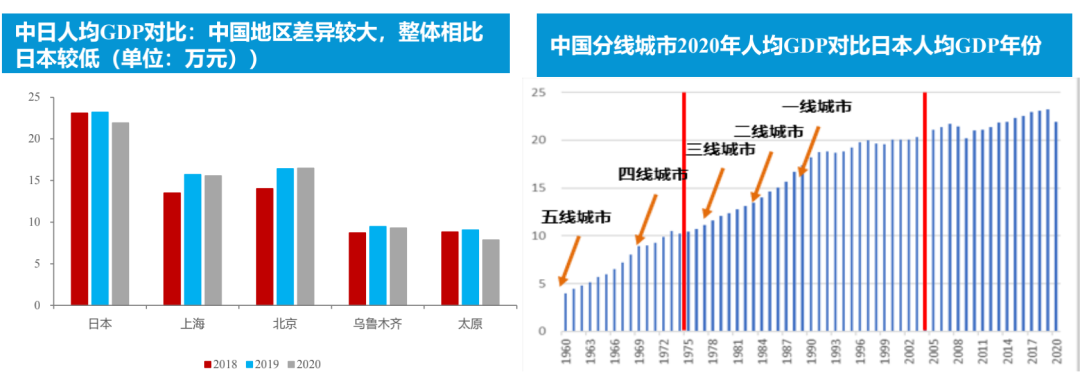 另一方面,中国东西部/城市与农村经济发展层次丰富,消费观念变迁比日本要复杂。一线城市以类似日本出现第四次消费观念,四五线城市还仍处于第一到第二消费切换阶段。