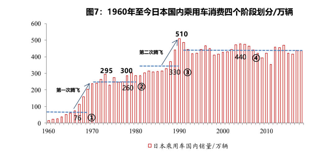 第三阶段是80-90年代的二次腾飞期,乘用车销量复合增速4.9%(其中1988-1990年平均复合增速一度超过15%),峰值甚至达到510万辆的新高。此时依然处于追求差异化的第三消费阶段。