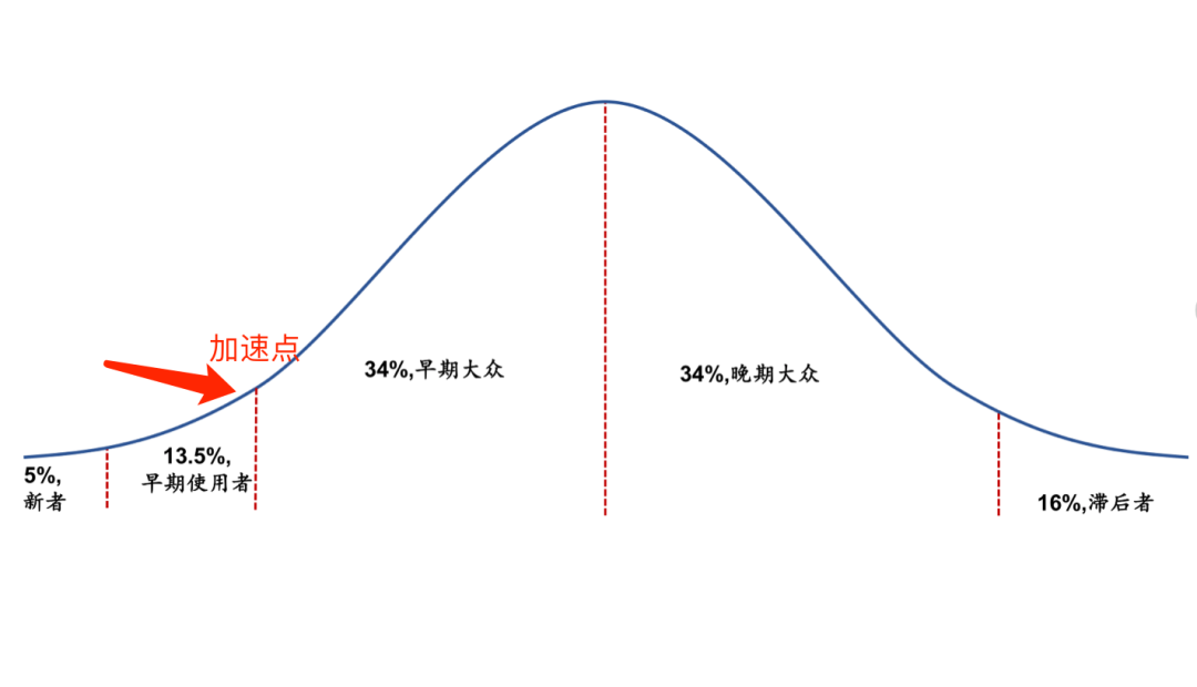 一开始,新事物的传播速度会比较慢,但当接受它的人群规模(也就是渗透率)到了某个临界点(一般为10%-25%),扩散的速度会突然加快。背后的原理来自羊群效应,第一批吃螃蟹的都是少数,但当吃螃蟹的人越来越多达到一定规模时,会出现明显的跟风。