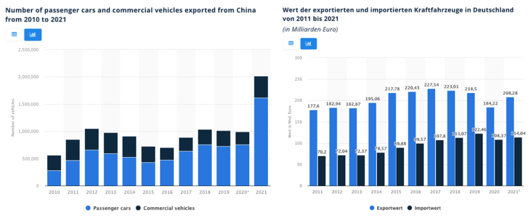 △ 左图:2010年-2021年中国乘用车及商用车出口数量变化;右图:2010 年至 2021 年德国汽车进出口总值(来源:Statista)