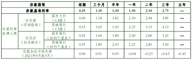 表:2021年存款利率上限确定方法优化前后对比 资料来源:中国人民银行,《2021年三季度货币政策执行报告》