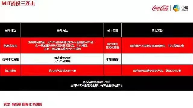 电厂拿到一份2021年9月份可口可乐“蒙战元气”为主题的对战计划,其策略包括用可口可乐无糖系列产品(包括零度可乐、雪碧零卡、芬达零卡、雪碧纤维、小宇宙等),冲击元气森林线下终端客户。比如,在元气森林产品两侧陈列可口可乐产品。