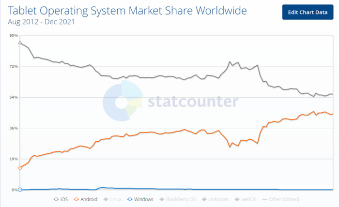 而且苹果二合一笔记本的面世很有可能会极大改善二合一笔记本市场的现状。毕竟如今的二合一笔记本吸引力并没有传统的笔记本电脑和平板电脑高,根据调研机构Statcounter数据显示,从2012年到2021年,世界范围内平板电脑市场上的主角依旧是iOS和安卓,搭载Windows的平板/二合一平板电脑一直处于“躺平”阶段,市场占有率也仅仅只有0.03%。