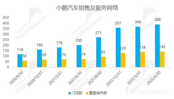 截止 2022 年 6 月底,公司全国销售门店数量 388 家,小鹏的销售网络是直营和经销相结合的模式(蔚来和理想全部直营),2021 年增加经销模式,加盟店销售佣金从 2021 年二季度开始在报表中体现。