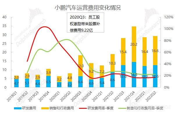 4、研发/销售保持高投入,刚性费用挤压利润。研发费用和销售费用具有持续性,本季两项费用继续保持高投入。研发高投入,是小鹏一直坚持着 “智能和全栈自研” 的战略定位;销售高投入,是小鹏现阶段仍有继续拓宽网络,触及更多终端需求的诉求,因此海豚君认为小鹏这两项费用相对刚性,在较长一段时间内都会挤压公司的利润。二季度在收入/交付量疲软,成本和费用上升的情况下,公司本季营业利润亏损继续扩大。