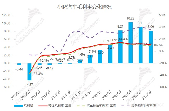 小鹏汽车业务结构简单,整体毛利率取决于汽车销售毛利率。2022 年二季度小鹏汽车整体毛利率 10.9%,环比下降 1.3pct,略低于彭博一致预期的 11.1%。