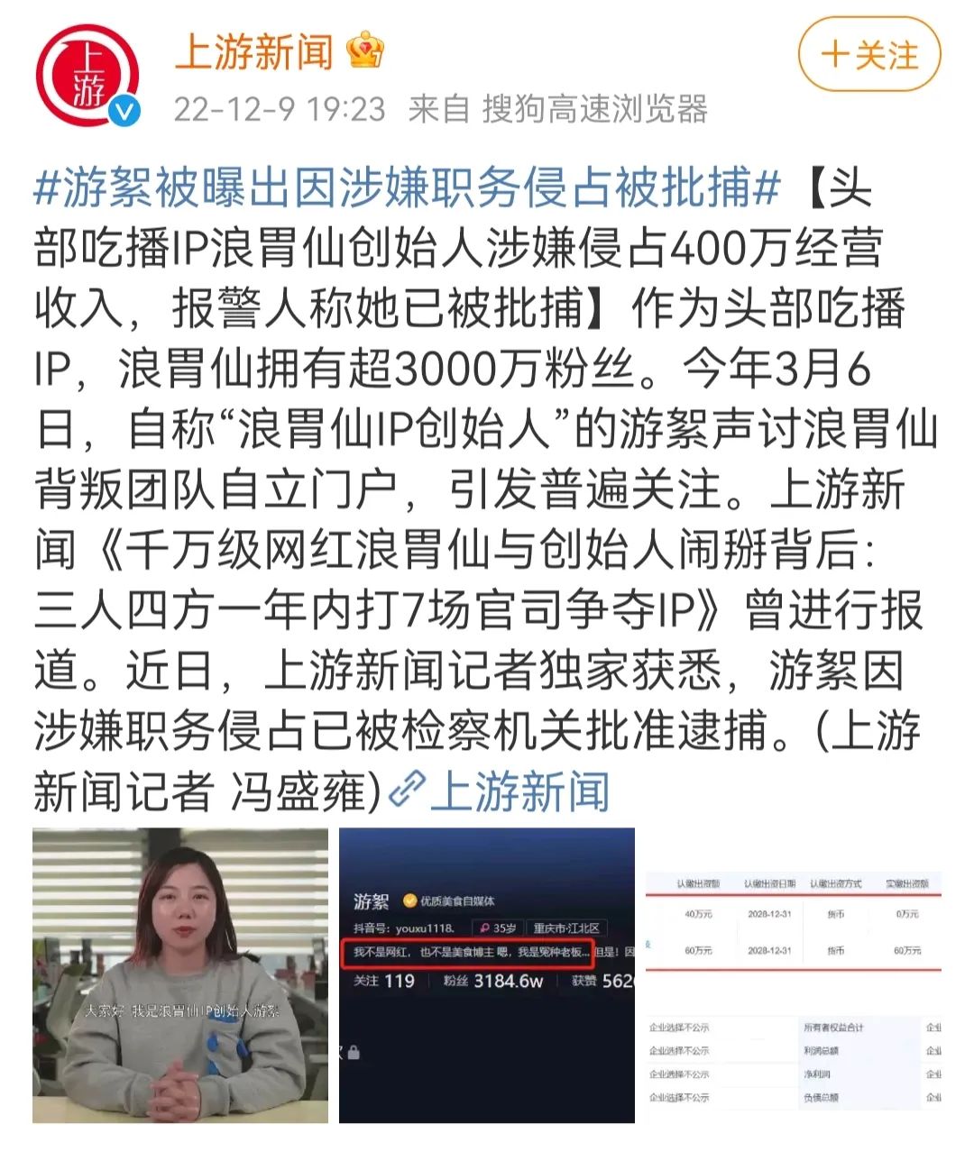 “浪胃仙”IP创始人游絮因涉嫌职务侵占400万元被检察机关批准逮捕,而另起炉灶的浪胃仙本人在近一个月的带货成绩超2500万元。