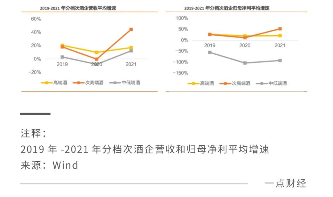 比如,茅台批价的持续拔升,给酒企在千元价格带打开空间。高端千元价格带的打开,为次高端600元-800元及300元-500元价位腾出上涨空间,价格梯队上的“高带低”为酒企业绩注入了持续动力。Wind数据显示,2019年-2021年在分档次酒企营收和归母净利平均增速上,高端酒和次高端酒增速明显高于中低端酒。