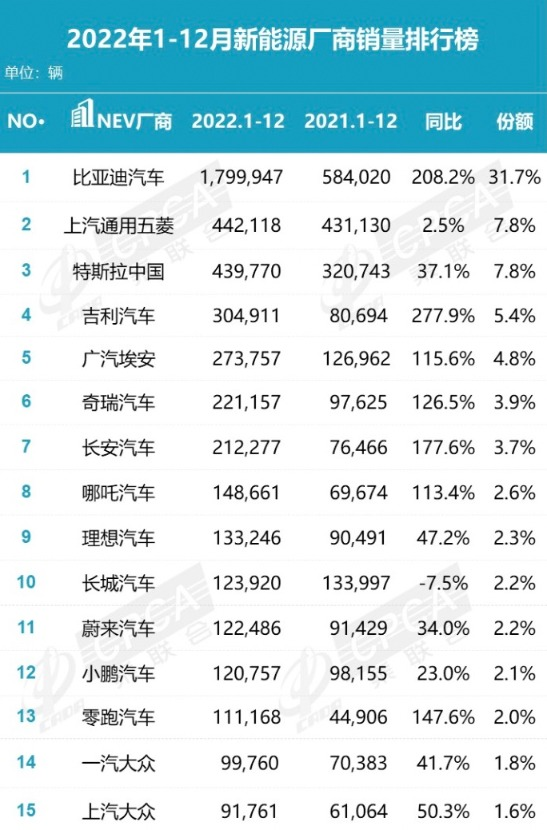 据2022年新能源车1-12月销量top 15排行榜,除理想汽车排名第9,蔚来、小鹏均跌出前10,位列第11、第12。