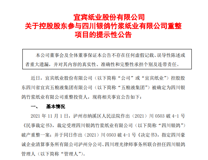 日前,据宜宾纸业(600793.SH)最新公告,其控股股东四川省宜宾五粮液集团有限公司(简称:五粮液集团)被确定为四川银鸽竹浆纸业有限公司(简称:四川银鸽)重整投资人,若项目顺利实施,五粮液集团将取得四川银鸽的经营性资产和相关业务,并将其业务、资产注入宜宾纸业。