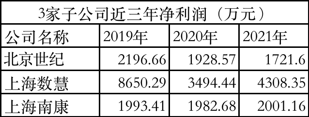虽然收购完成后,3家标的均完成了业绩承诺,但商誉减值风险却没有随之消失。从2019至2021年公司披露的净利润来看,北京世纪业绩呈现下滑态势,上海数慧的净利润也在2020年“腰斩”。
