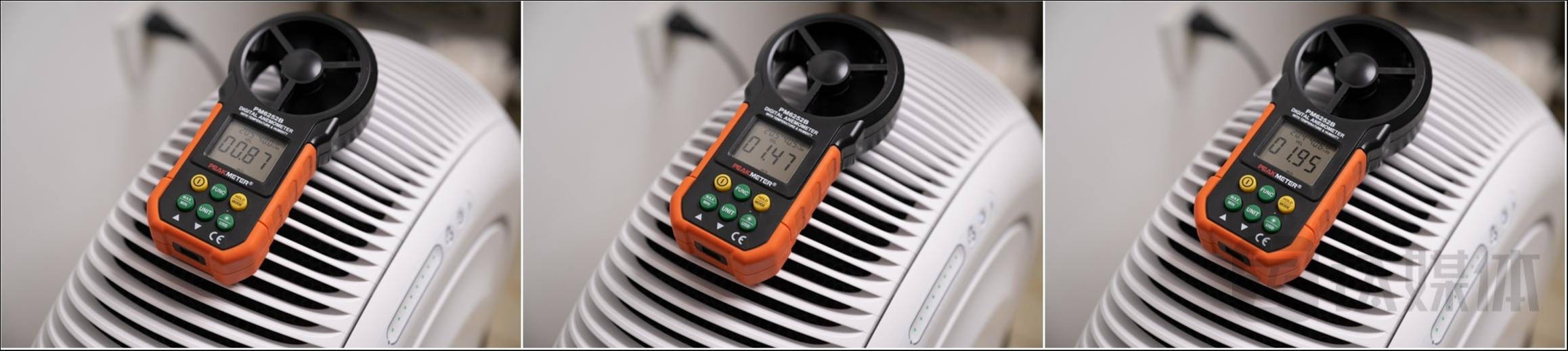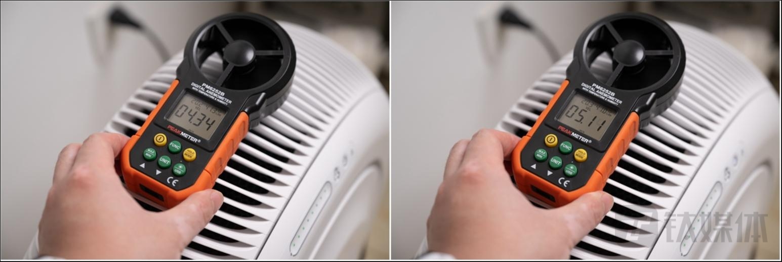 实际的测试方面,通过将风量计放置在产品的出风口,就能获取到产品净化空气的输出能力,通过对产品出风口的测试可以看到,产品的13档风量分别为0.87、1.47和1.95m³/s,结合其相比传统顶置出风口更大的出风面积,对于2030㎡的房间,使用低档位就能完全满足空气净化需求。