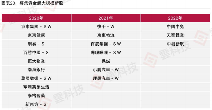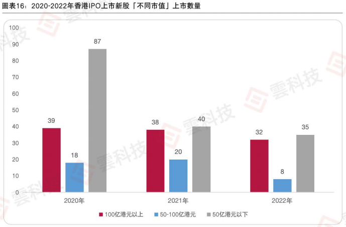 新股数量大跌,超大规模和大型新股上市宗数锐减等原因,令港市全年融资额大幅缩减。对比来看,2020年至2022年,港股募集资金超大规模新股分别有10只、7只、3只。