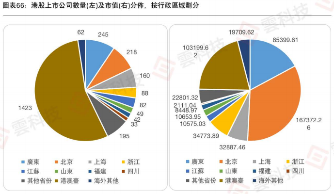 比之过去20年,当前的港股市场变化巨大,曾经,金融股和地产股占据市场主导地位,但随着科技公司的涌入,科技股已经逐渐成为港股市场最重要的组成部分。另外,内地上市公司数量为1112家,占港股总数的42.8%,占港股总市值的比例达到75.3%,其中广东地区的上市公司数量最多,达245家。
