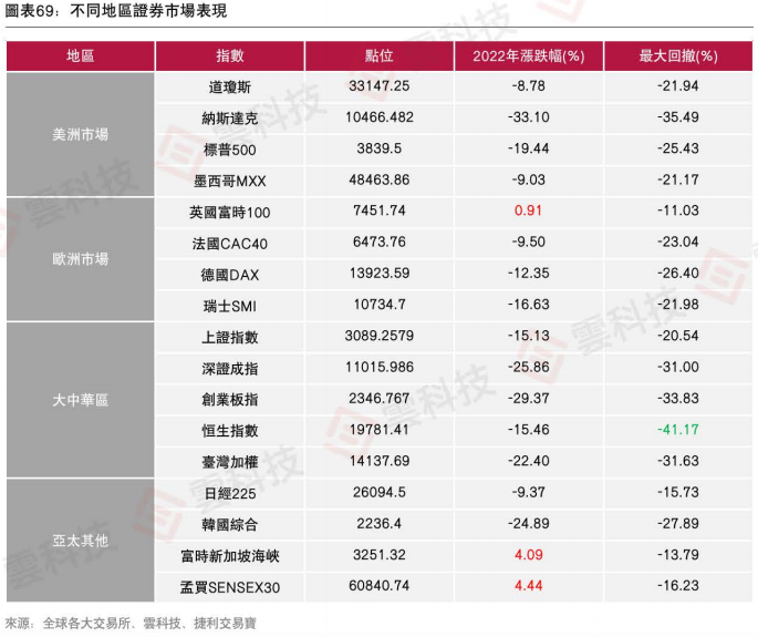 不过放眼全球来看,港股市场并非“孤独下坠”。2022年,在内地市场,创业板指表示全球倒数,累计跌幅29.4%,上证指数、深圳成指分别下跌15.1%、25.9%;在美国市场,纳斯达克指数表现全球最差,累计下跌33.1%,道琼斯指数、标普500指数分别累计下跌8.8%、19.4%。全球主要证券市场中,仅印度、新加坡及英国市场取得正涨幅。