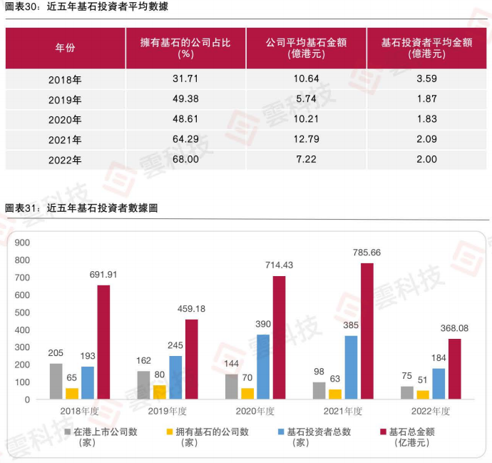 在新股发行越来越艰难的时期,基石投资者的重要性更加凸显。在2022年,有51只港股新股有基石参与,占比高达68%,基石累计投资金额近370亿港元,同比下滑54.31%。回顾过去,2018年至2022年,公司上市数逐年下滑,但拥有基石的公司数未随新上市公司数的下滑而下滑。