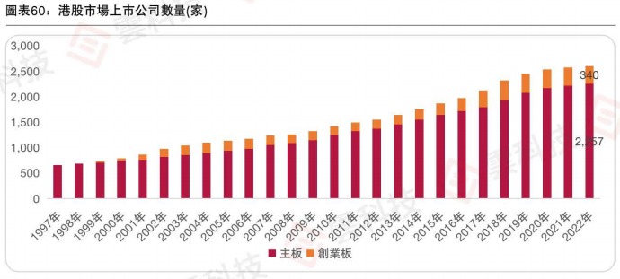 香港恒生指数在2022开年后就连续下跌,在10月底曾跌破15000点,创2009年以来新低,但11月开始港股市场迎来转变,带动全年跌幅大幅收窄。截至2022年末,港股市场的上市公司总数达到2597家,同比增加了25家,主板上市公司数量达到2257家,创业板(GEM)上市公司数量达到340家。