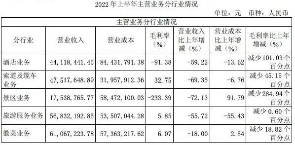 黄山旅游是国内众多山岳类景区的缩影,主营业务聚焦于景区、索道、酒店、旅行社、徽菜餐饮五大传统板块。其中2022上半年亏损最严重的是景区业务与酒店业务,景区业务的毛利率为-233.39%,酒店业务的毛利率则为-91.38%,高毛利业务索道及缆车毛利率亦下降了45.15%。
