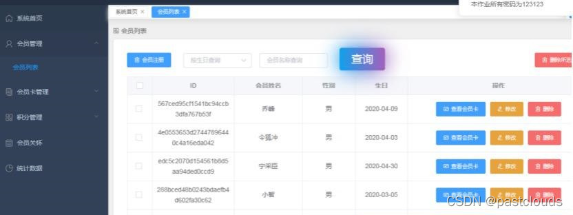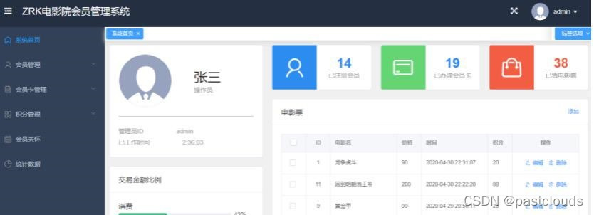 项目是一套电影院会员管理系统,使用前后端分离架构开发,前端基于Vue.js+Element UI技术,后端使用springboot+mybatis实现,包含管理员、会员管理、会员卡管理、电影票、消费记录、数据统计等模块
