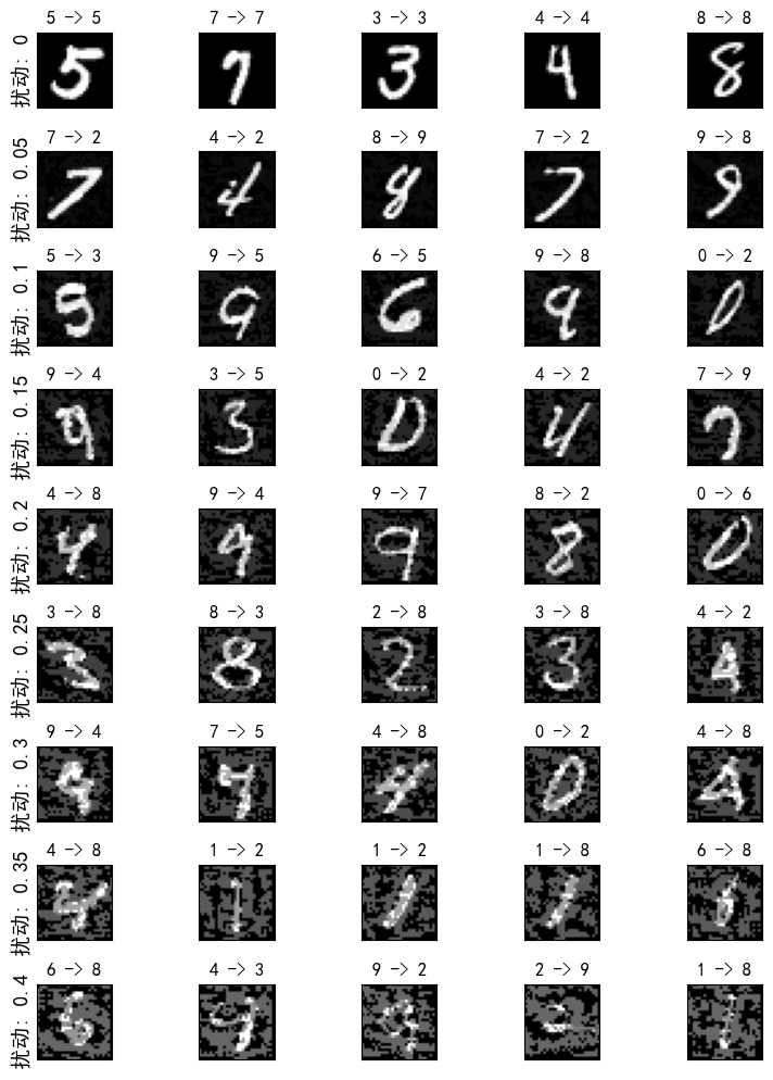 扰动量: 0 Test Accuracy = 9810 / 10000 = 0.981 扰动量: 0.05 Test Accuracy = 9427 / 10000 = 0.9427 扰动量: 0.1 Test Accuracy = 8510 / 10000 = 0.851 扰动量: 0.15 Test Accuracy = 6826 / 10000 = 0.6826 扰动量: 0.2 Test Accuracy = 4299 / 10000 = 0.4299 扰动量: 0.25 Test Accuracy = 2084 / 10000 = 0.2084 扰动量: 0.3 Test Accuracy = 872 / 10000 = 0.0872 扰动量: 0.35 Test Accuracy = 352 / 10000 = 0.0352 扰动量: 0.4 Test Accuracy = 167 / 10000 = 0.0167