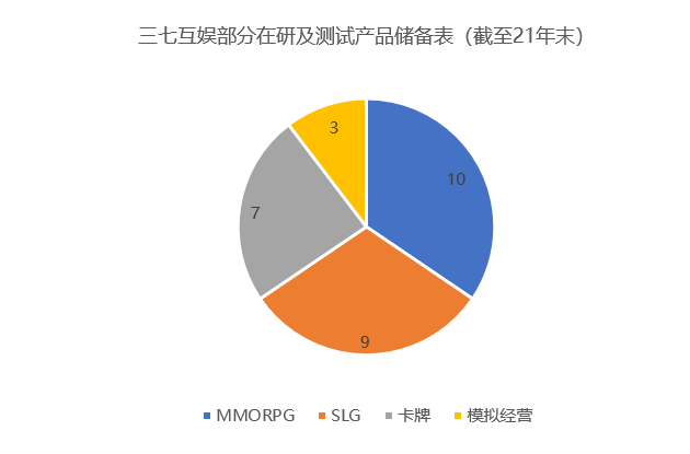 截至21年末,三七互娱储备游戏29款,从储备游戏来看公司已形成SLG、MMORPG、卡牌、模拟经营多元化发展的格局,对传统ARPG类游戏的依赖度有所降低。