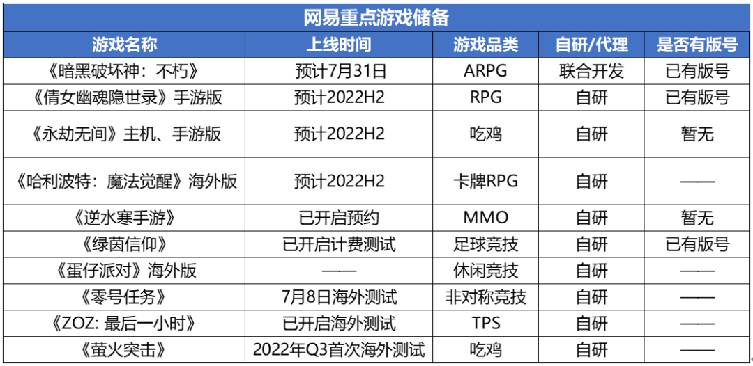 网易22年依然以自研产品为主。从游戏品类来看,竞技、吃鸡类游戏是网易22年重点布局的赛道。