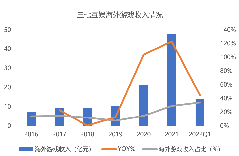 21年三七海外游戏收入达47.77亿元,收入占比达29%;22年Q1海外游戏收入超14亿元,占总收入1/3以上。