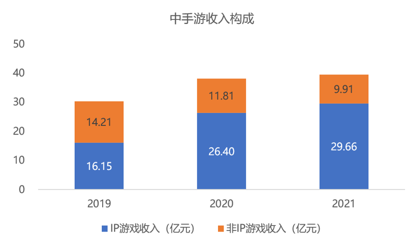 2019年以来,中手游IP游戏收入稳步增长,2021年IP游戏收入高达29.66亿元,占公司总收入的比例约为75%。