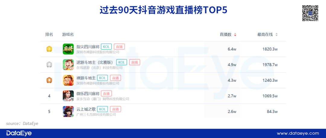 根据DataEye-ADX数据显示,过去90天,《云上城之歌》直播场数位列抖音游戏直播榜第5名。