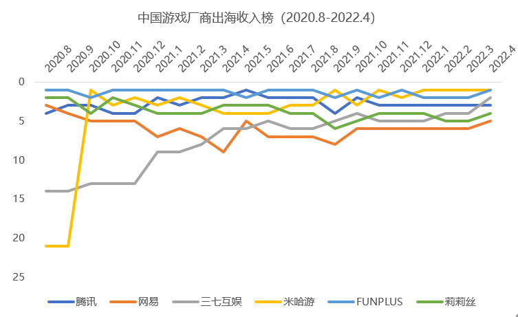 相应地,20年以来三七互娱海外收入排名迅速上升。data.ai 数据显示,三七互娱从10名开外跻身前五,最新一期排名已杀入榜单第二名。
