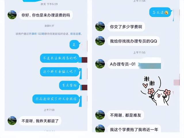 在怀疑之际,和小白的经历类似,寻月也遇到了退费群友,对方以过来人热心帮忙的身份出现,自称“昨天就退费了”,他还好心给寻月找了办理专员”,并强调“都是难友,这个学费拖了我将近一年”。