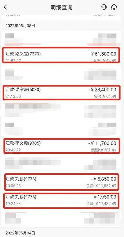 小白当日的转账记录,红色部分为被骗所转账的金额 / 受访者供图