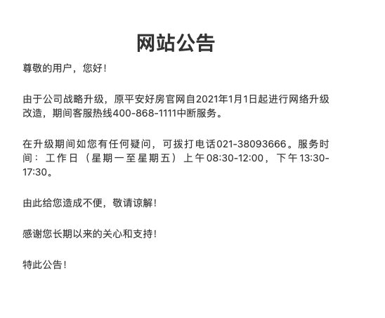 在几年前,平安还推出过平安好房网。据称,平安好房推出新的互联网金融产品“好房贷”,包括首付分期贷款、按揭贷款、过桥贷款、赎楼贷款等,不过该网站已于2021年1月中断服务。