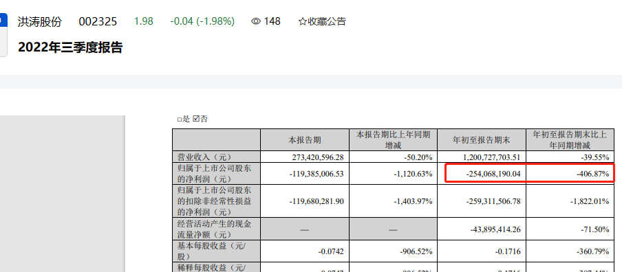 2022年三季度,洪涛股份净利润为-2.54亿元,同比大降406.87%。同期,洪涛股份经营活动产生的现金流量净额为-4389.54万元,同比下降71.50%。