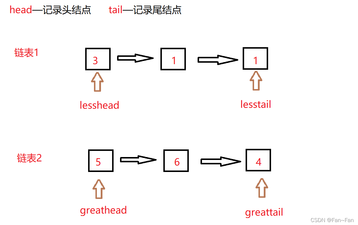 这道题的思路和我们以前用的归并思想一样,我们创建指针变量list1和list2来遍历链表,同时创建指针变量head,初始化为空指针,然后创建指针变量tail用来保存新链表的尾端,因为当链表结点插入到新的链表的尾端,尾端地址会发生改变。