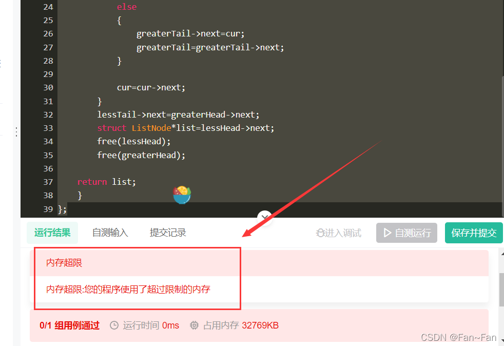class Partition { public: ListNode* partition(ListNode* pHead, int x) { struct ListNode*lessHead,*lessTail,*greaterHead,*greaterTail; lessHead=lessTail=(struct ListNode*)malloc(sizeof(struct ListNode)); greaterHead=greaterTail=(struct ListNode*)malloc(sizeof(struct ListNode)); lessTail->next=greaterTail->next=NULL; struct ListNode*cur=pHead; while(cur) { if(cur->val<x) { lessTail->next=cur; lessTail=lessTail->next; } else { greaterTail->next=cur; greaterTail=greaterTail->next; } cur=cur->next; } lessTail->next=greaterHead->next; struct ListNode*list=lessHead->next; free(lessHead); free(greaterHead); return list; } };当我们程序运行时,出现了内存超限的报错,But,Why