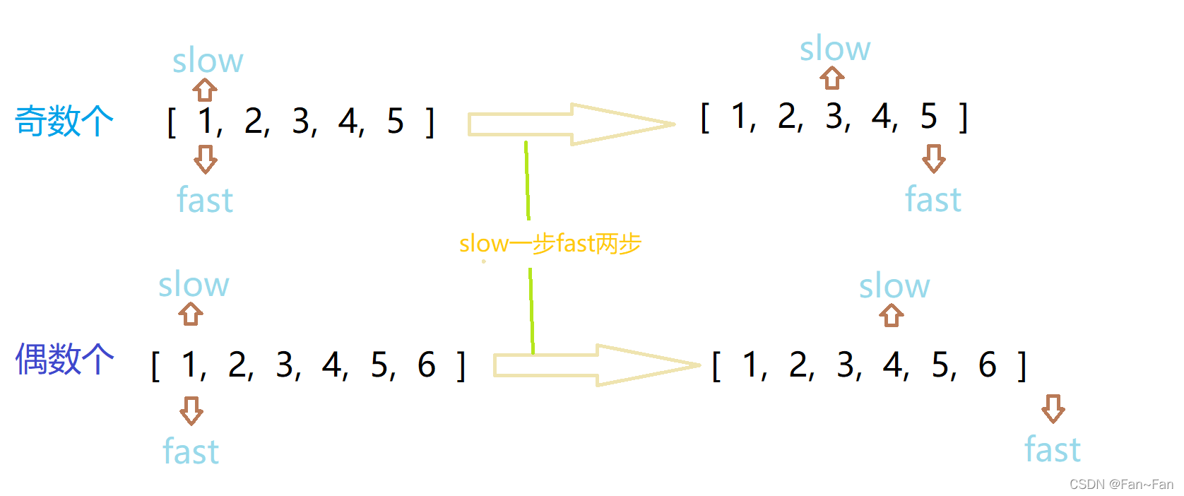 创建两个指针变量slow和fast,刚开始都指向链表的头结点,然后slow向前移一步的同时,fast向前移动两步,如果链表的结点为奇数个,当fast指向最后一个结点时,slow指向的就是中间结点,如果为偶数个,则当fast为空指针,slow指向的就是中间结点。