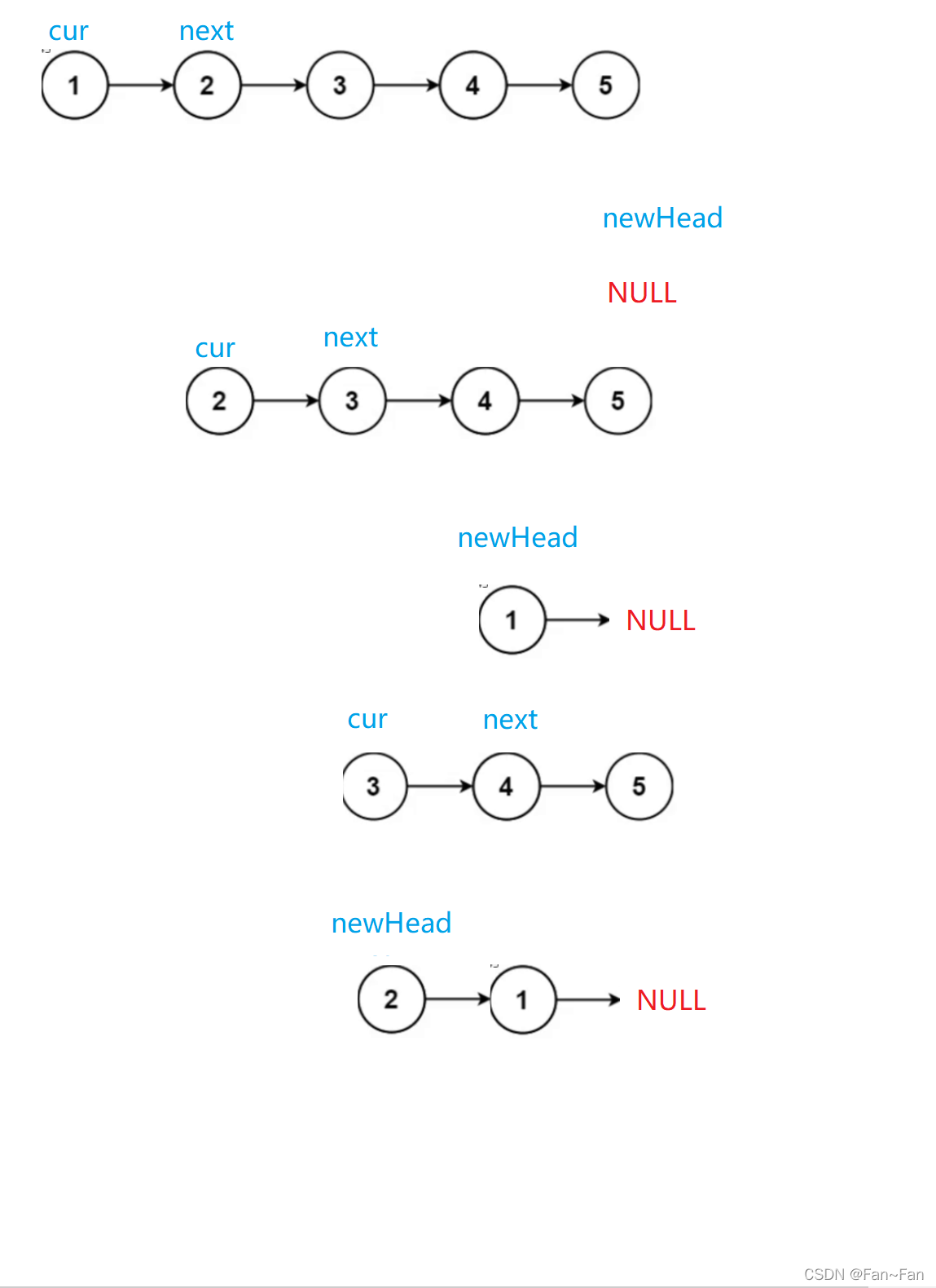 struct ListNode* reverseList(struct ListNode* head) { struct ListNode* newHead = NULL; struct ListNode* cur = head; while (cur) { struct ListNode* next = cur->next; //头插 cur->next = newHead; newHead = cur; cur = next; } return newHead; }