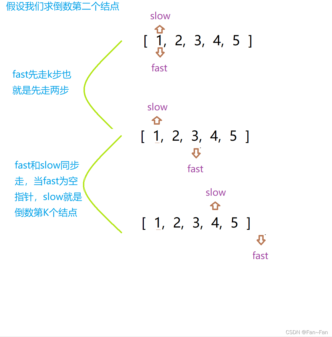 我们创建两个指针变量slow和fast,刚开始都指向链表的头结点,然后fast先走K步,fast走完后,slow和fast同步走,当fast指向空指针时,slow所指向的结点就是倒数第K个结点。
