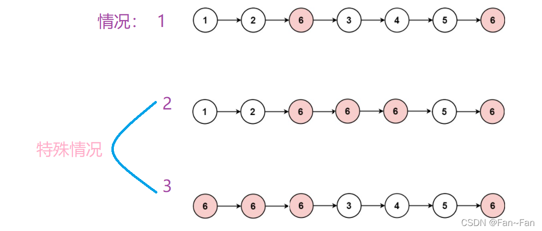 我们可以创建一个指针变量cur来遍历链表,当cur->val==val时,我们就需要删除此结点,但链表是连续的,free结点的同时还需要保留上一个结点的地址,所以我们用指针变量prev来保存上一个结点的地址,同时我们做这道题也要考虑到特殊情况,比如头结点就是所要删除的结点,以及链表中间有好几个结点都是需要删除的结点。