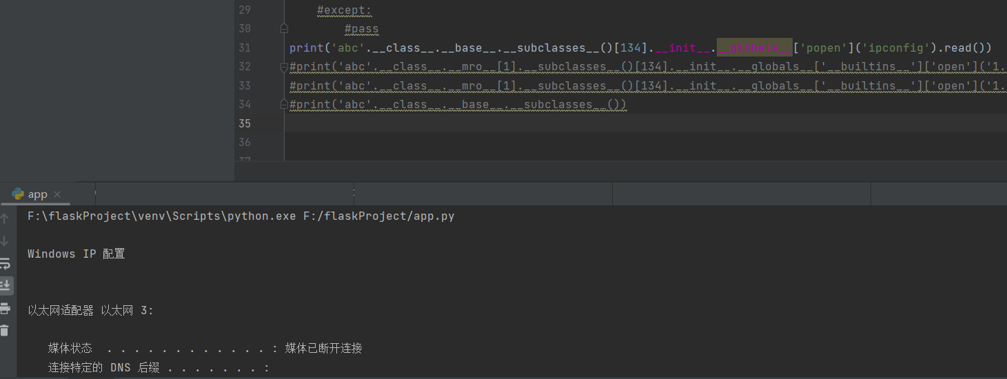 接下来,就可以继续往下了__init__(初始化方法),再通过__globals__(访问全局变量,字典),通过popen,以及read方法来进行系统命令执行(如我执行的ipconfig)