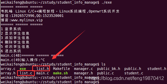 在代码中,我们定义list.c和list.h文件来管理“链表”的操作。使用链表来管理学生信息,如下: