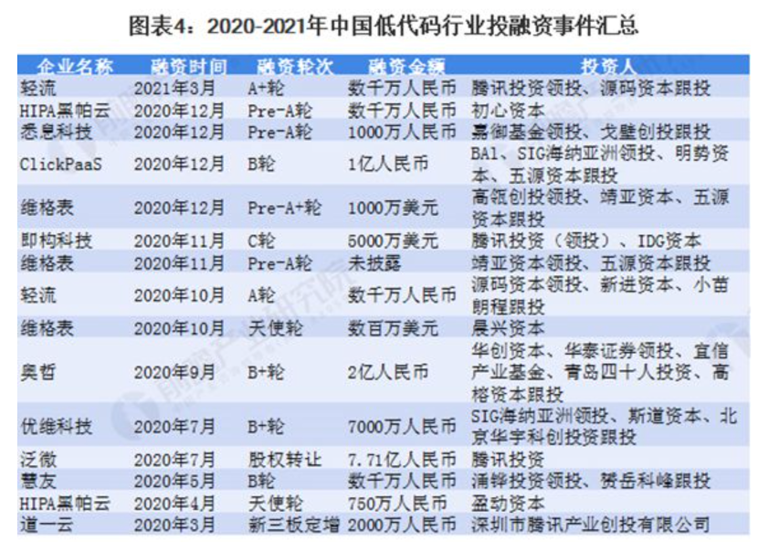 中国低代码行业投融资事件汇总图源前瞻产业研究院