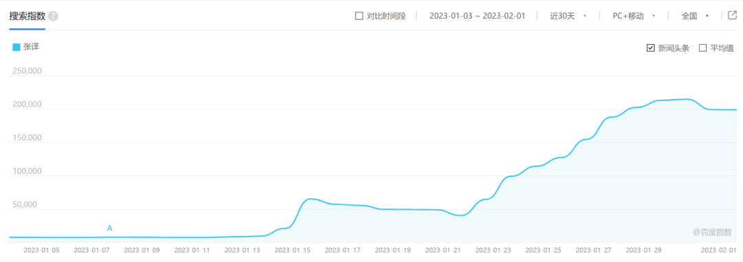 同一时间,张译又是爆火电视剧《狂飙》中令人印象深刻的警察安欣。1月14日《狂飙》开播后,热度不断上升,霸榜微博热搜。张译的百度指数从电视剧上映前的几千增加到大结局当天的20万左右。有网友甚至在微博建议“红到发紫”的张译:“设置个自动回复吧”。