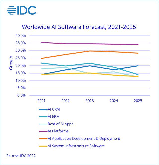 “据IDC统计,全球人工智能收入预计到2022年同比增长19.6%,达到4328亿美元,包括软件、硬件和服务。并预计2023年将突破5000亿美元大关。在增长方面,人工智能平台预计表现最佳,五年复合年增长率为34.6%”。