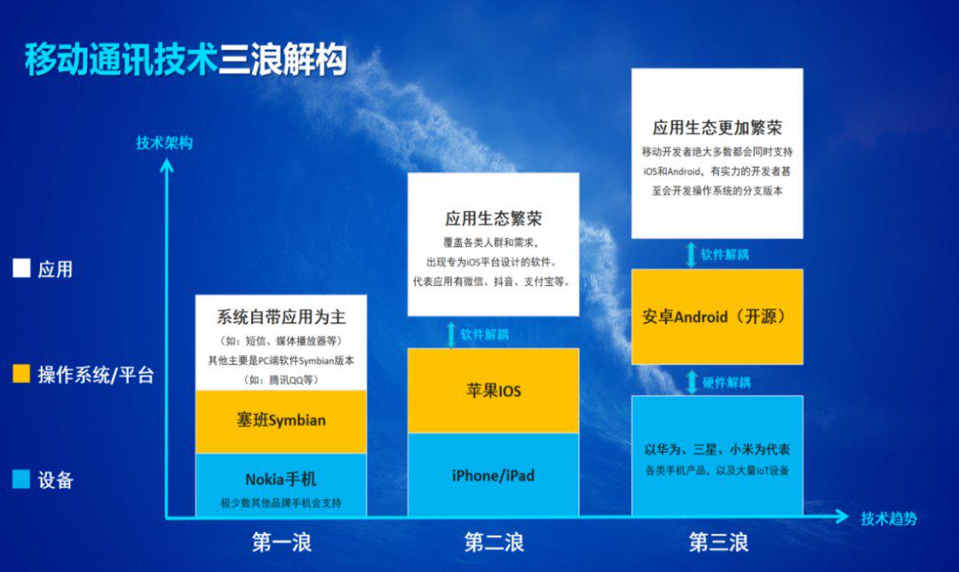 “移动通讯三浪理论”即移动通讯行业经历的三个时期,分别是功能机时代、智能机时代及移动互联网时代。