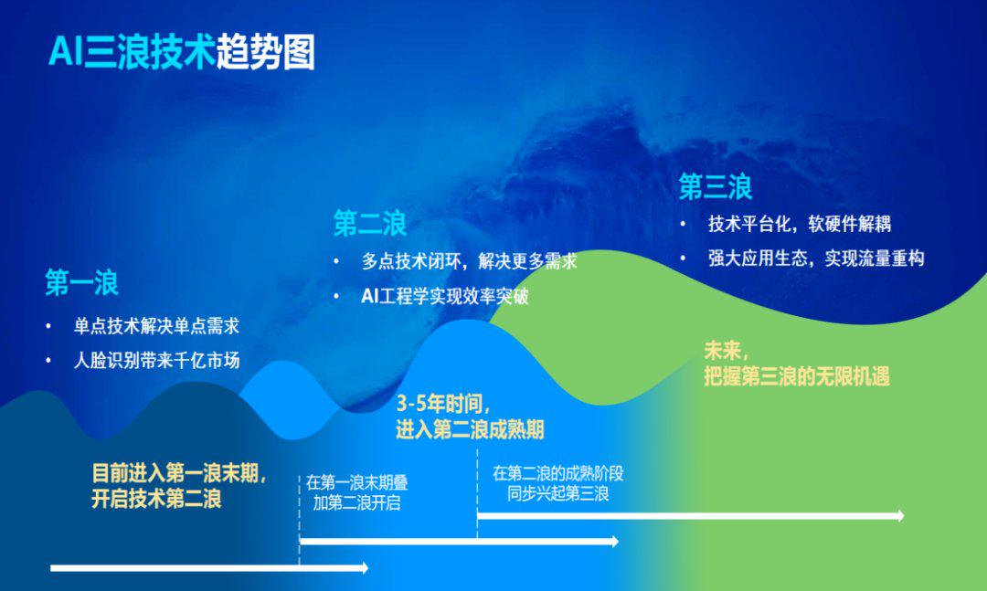 即第一浪为单点技术解决单点需求,如人脸识别的千亿市场;第二浪为多点技术闭环形成AI工程学,如云从人机操作系统,其潜在的应用市场达到5000亿元级;第三浪为智能平台的出现,其潜在的市场规模将在万亿级。