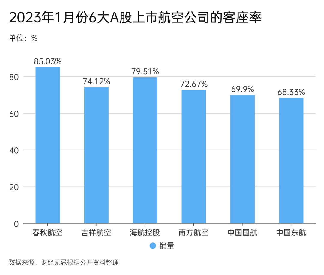 2022年1月-10月,春秋航空的客座率为74.8%,位居首位。而刚刚发布的1月各大A股上市航空公司的客座率,春秋航空以85.03%继续领先。
