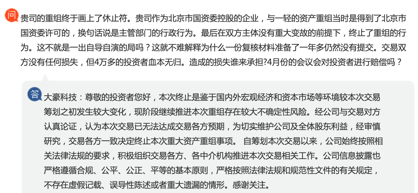 此事也引发了众多投资者的不满。股吧内,投资者纷纷抱怨,“用重组来忽悠散户”,“想跑也没机会了”。还有投资者在互动平台提问质疑这是否为公司“一出自导自演的局”。